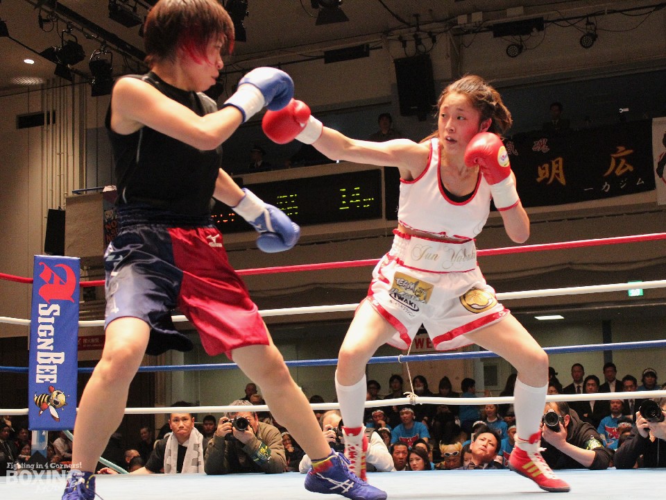 第5試合では女子ライトフライ級8回戦、OPBF同級1位の矢吹純(25=協栄)とOPBF同級2位の緒方汐音(28=ワイルドビート)が対戦。ノンタイトル戦ながら1位と2位による事実上の次期挑戦者決定戦となった一戦は、細かい連打を繰り出す緒方に対し、矢吹は右フックをヒットしポイントを稼いだ。一進一退の攻防となったが、有効打で上回った矢吹が3〜4ポイント差をつけ判定勝ちした。