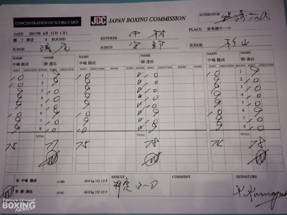 序盤は、サウスポーの中嶋の左ストレートが当たり先手を取ったが、3回以降は柳がプレスをかけて右ボディを叩いて反撃。一進一退の攻防となったが、終盤は柳の連打がポイントを奪う形となった。ジャッジは2〜4ポイント差で柳を支持した。久しぶりの日本ランキング入りを濃厚とした。