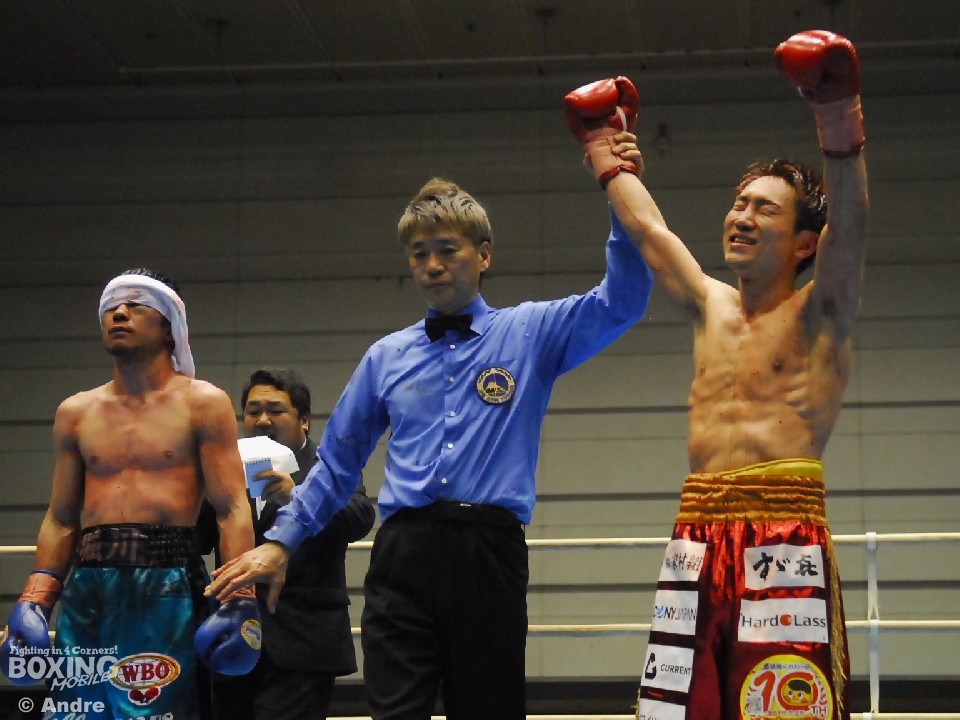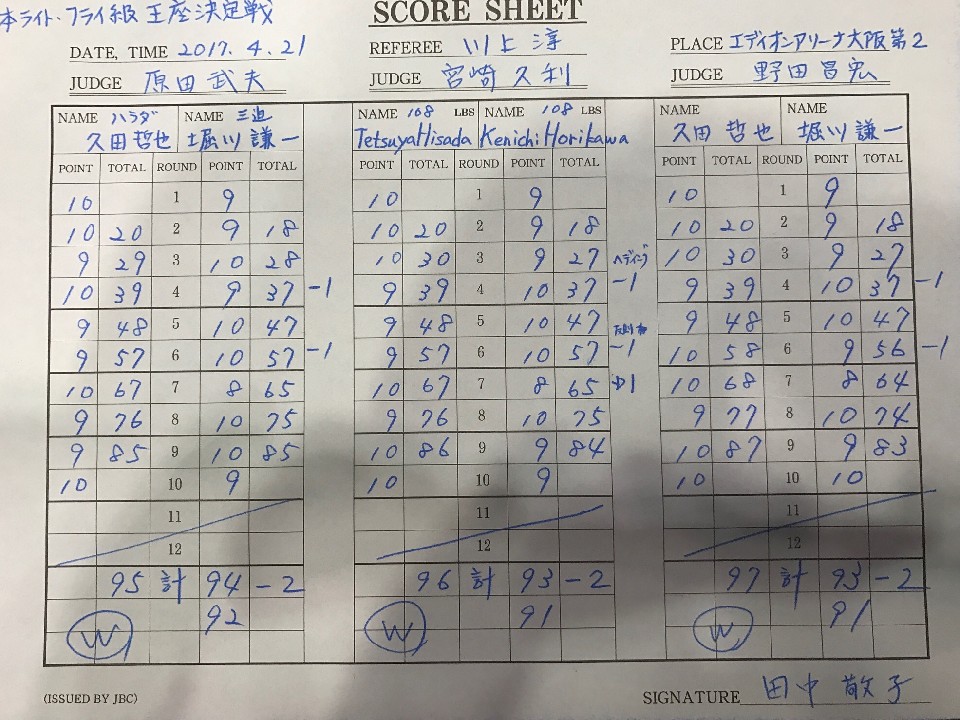 試合は、技術力の高い激戦となった。序盤、過去久田との対戦では、2戦2勝の堀川が左アッパーを起点に攻め込むと、久田はワンツーを主体に組み立て一歩も引かない。距離の近い両者はバッティングにより目の上をカットし流血戦となる。4ラウンド、堀川の再三のヘディングに対して減点が宣告された。5ラウンド終了時点での採点は3者が久田を支持。後半巻き返したい堀川だったが、7ラウンド、久田の右をもらった堀川はバランスを崩しダウン。ひどい流血が続く中、渾身の打ち合いをみせる両者だが決定打は生まれず。判定は久田に軍配が上がり念願のベルトを手した。