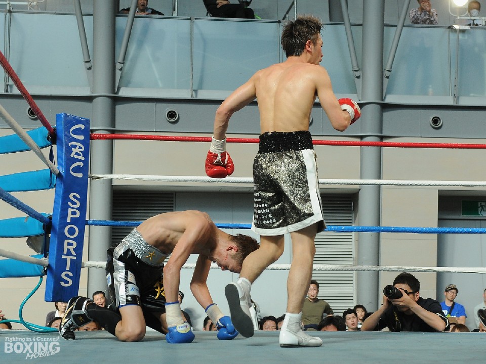 序盤は大里登(21=大鵬)の精度の高いジャブに阻まれ、仕掛けるタイミングを逸した水野だったが、4回からワンツー、フックで打って出ると、大里を追い込みチャンスを作った。大里も足を止めては果敢に打ちあったが、ボディを効かされると次第にガードが下がり、最後は左フックを直撃されダウン。このままレフェリーストップを呼び込んだ水野が6回TKO勝ちを飾り、日本スーパーフェザー級12位の石田凌太(21=宮田)と争う8月の日本スーパーバンタム級ユース王座決定戦に弾みをつけた。