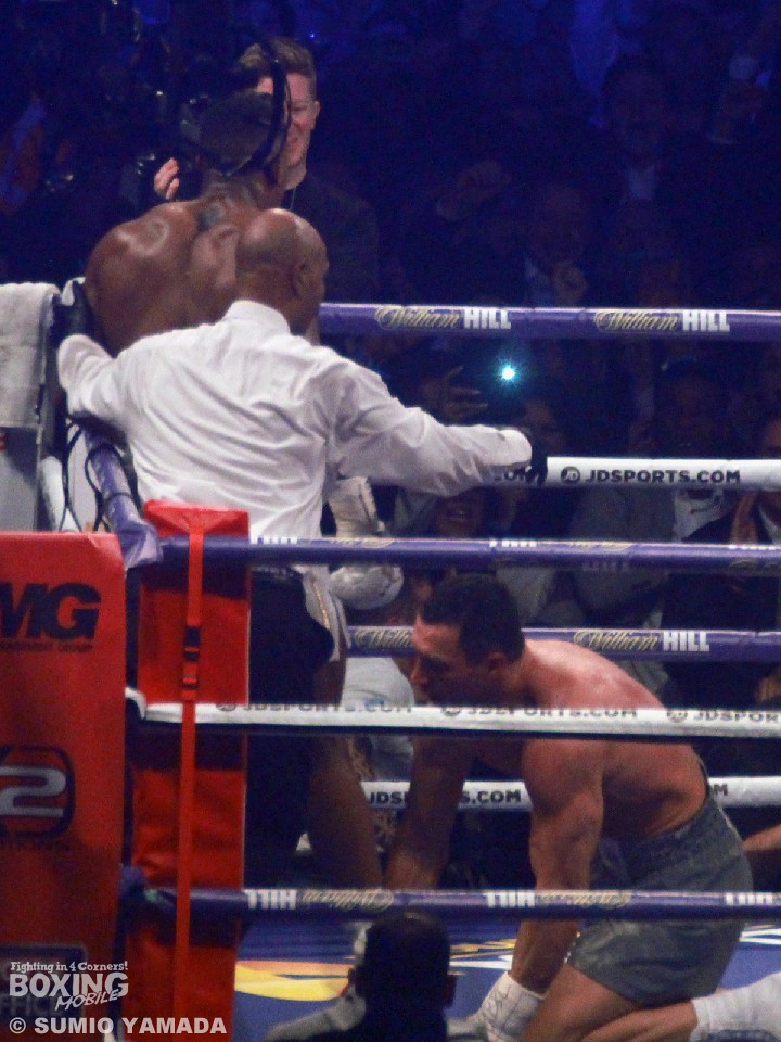 2度目の山は続く6回のこと。クリチコがインサイドから打ち抜いた右ストレートでダウンを奪い返したのだ。腰から崩れ落ちたジョシュアはカウント9で戦闘ポーズをとったがダメージは甚大だった。しかし、クリチコにも疲労の色がみえ、仕留めきれなかった。その後はクリチコが左を中心にして試合をリードしたが、8回になるとジョシュアにも回復の兆しがみえ、9回、10回とほぼ互角に渡り合った。