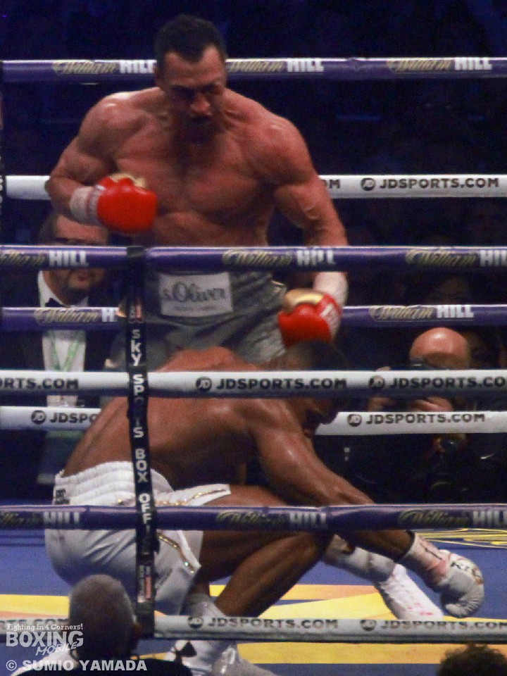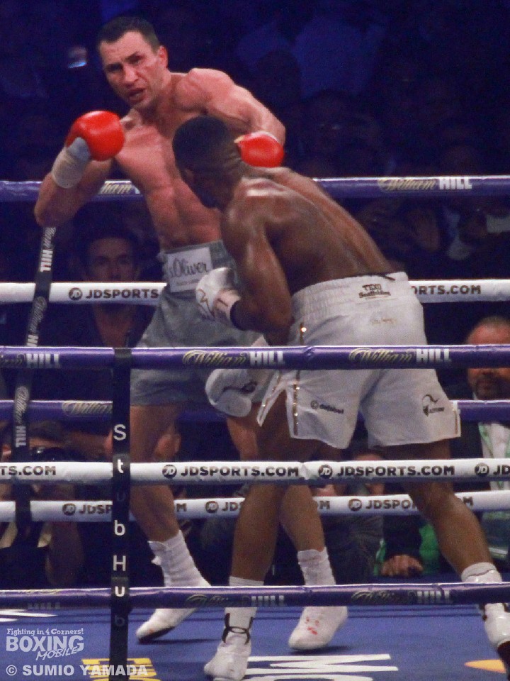 9万人の大観衆が見守るなか、ともにフェイントを多用しながら左で探り合う。2回にクリチコが右を浅くヒットして好調を印象づけた。クリチコは4回にも右ストレートを当てたが、ジョシュアもワンツーを浅くヒットして譲らない。ともにオーバーペースかと思われるほど速いペースで前半を戦い終えた。最初の山は5回に訪れた。流れを引き寄せようとジョシュアがラッシュ。そのなかで左フックから左右が命中、引き落とすようなかたちにはなったがクリチコからダウンを奪ったのだ。再開後、ジョシュアはフィニッシュを狙ったが、スタミナを使い果たしたのか疲労の色が濃くなった。これを見てとったクリチコが反撃、左フックなどで王者を後退させた。ロープを背にしたジョシュアはフラフラの状態だった。この回にダウンを喫したクリチコは左目上をカットしたが、逆に流れを引き寄せたといえた。
