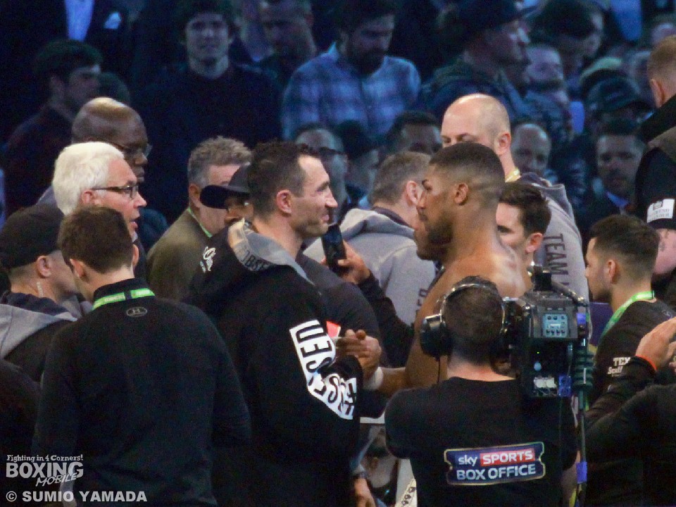 呼吸を整えてからインタビューに応じたジョシュアは「きょうはトレーナー、スタッフ、そして9万人の観衆に感謝したい。クリチコは模範的な人でリスペクトしている。全力を尽くさないと失敗すらできない。もっと強くなるよ」と、マイクを握って興奮気味に話した。今後について聞かれると「フューリー? 戦おうよ」と、休養している元3団体王者のタイソン・フューリー(英)に対戦を呼びかけたあと「誰とでも戦う」と答えた。19戦全KO勝ち。新時代の幕開けをアピールする価値ある勝利だった。敗れたクリチコは「ふたりともベストを尽くして戦ったが、強い者が勝った。きょうはアンソニーの方が強かった。私も彼のことはリスペクトしている。リマッチ? 興味はある」と再戦に含みを持たせた。69戦64勝(53KO)5敗。