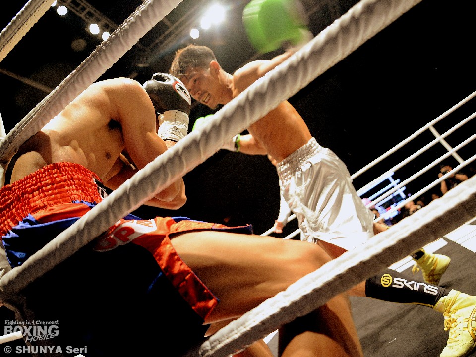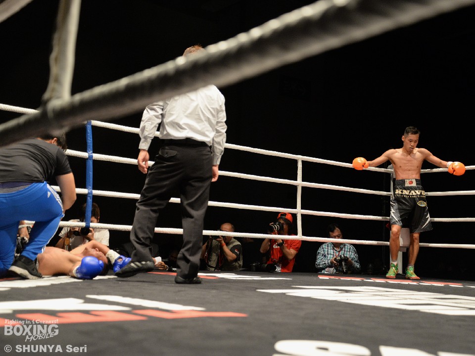 目の肥えた日本のボクシングファンにとっては、おそらく「格下のタイ人を倒し損ねた」ととらえる判定勝ちで前回、会場をなんとスタンディングオベーションに包み込んだのが渡邉だった。「“すばらしいテクニックだった”って退場するときも握手をいっぱい求められました」と誰より戸惑っていたのは渡邉自身だったが、いずれにせよ今回のメンバーで唯一、2大会連続の『DEF FIGHT NIGHT』参戦となった。自身のこだわりとして「2試合連続で判定までもつれ込むわけにはいかない」と宣言していたとおり、2回、左フックをテルダチャイ・ドンモンツリー(タイ)の顔面からボディにつなげて悶絶させた。観客はもちろん大喜び。前回と同様、大歓声で引き上げる渡邉を見送っている。
