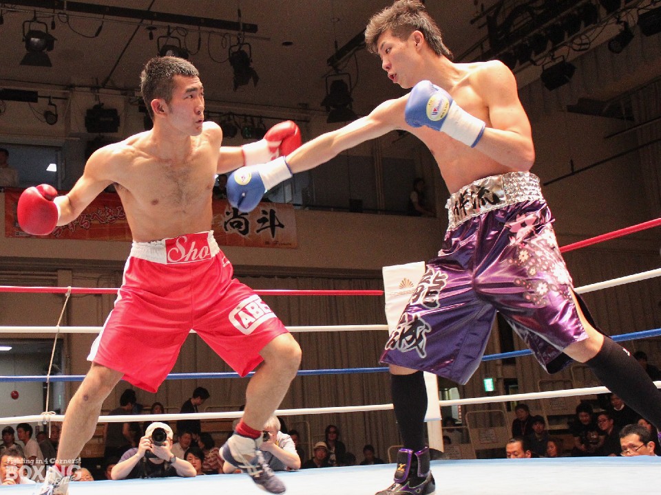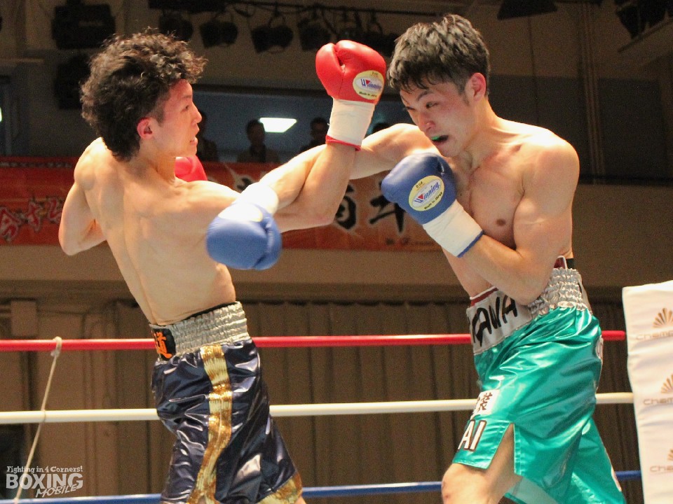 永田翔(22=アベ)と石井龍誠(20=伴流)が拳を交えたスーパーフェザー級6回戦。中間距離での主導権争いとなったが、サウスポー石井が左ストレートが決めて先制のダウンを奪った。その後も石井は単発ながら左を当ててポイントを稼ぎ試合終了のゴングを聞いた。ジャッジ3者ともフルマークの判定勝ちで石井が決勝にコマを進めた。