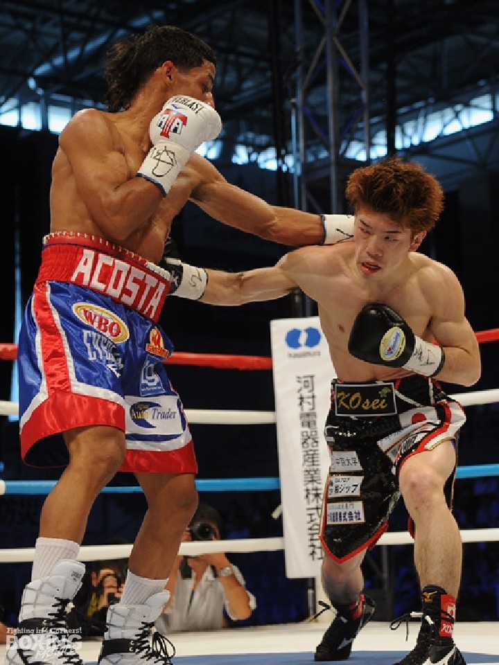 試合は序盤、田中のスピードに対して、アコスタが左右のフックを強振し追いかける展開。リングを大きく周り、アコスタとの距離を冷静に測った田中は鋭いジャブで先制した。アコスタは田中のスピードあふれるフットワークにパンチは単発に終わる。4ラウンド、田中のコンビネーションが決まりアコスタがダウン。中盤、焦りの色がみえるアコスタが強引に田中の行く手を塞ぐが右ストレートをもらい迎撃は不発に終わる。終始、ペースを握った田中は左右のフックから磨き上げた右ボディを決めアコスタにダメージを与え続け判定勝ち。見事初防衛に成功した。