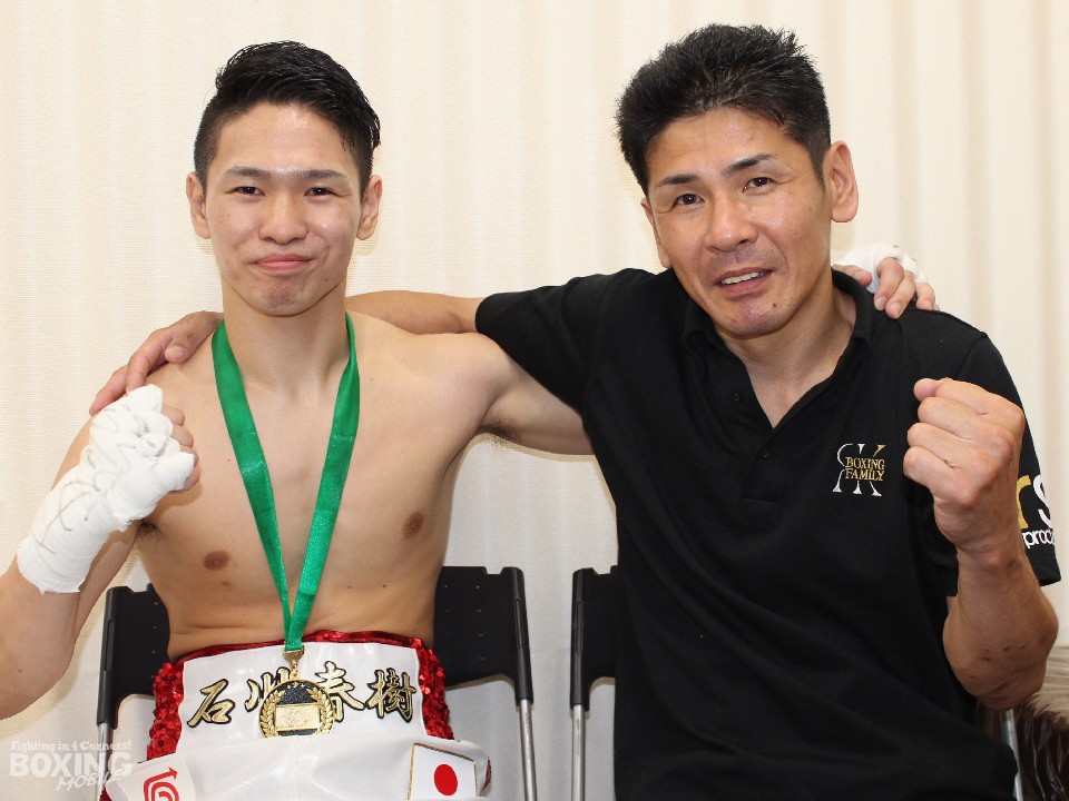 石川の父である洋トレーナーは「狙い通りだったが運良く当たった。今日は僕の仕事はなかったですね」と満面の笑みを浮かべた。1ラウンドKO勝利で賞金5万円を獲得した石川は「賞金で新しいグローブを買いたい。今年はあと2勝して来年の新人王戦に出場したい」と今後の抱負を語った。