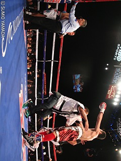 棒立ちのモンティエルに襲い掛かったドネアが右から左を当てると、モンティエルはロープに持たれて腰砕け状態に。ここでレフェリーが試合ストップを宣告した。