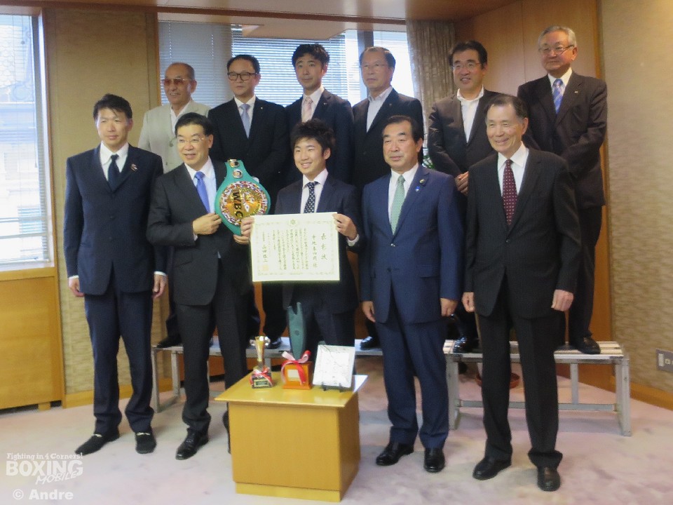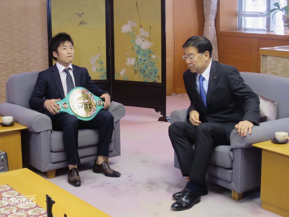 授賞式を終え、歓談に入ると山田啓二知事から「試合をテレビで見ましたけど、最終ラウンドの打ち合いはやっぱりキツかったかな」と、質問された拳四朗は「セコンドから相手は効いている、と言われていたので倒しにいったんですけど、倒せませんでした」と、返した。