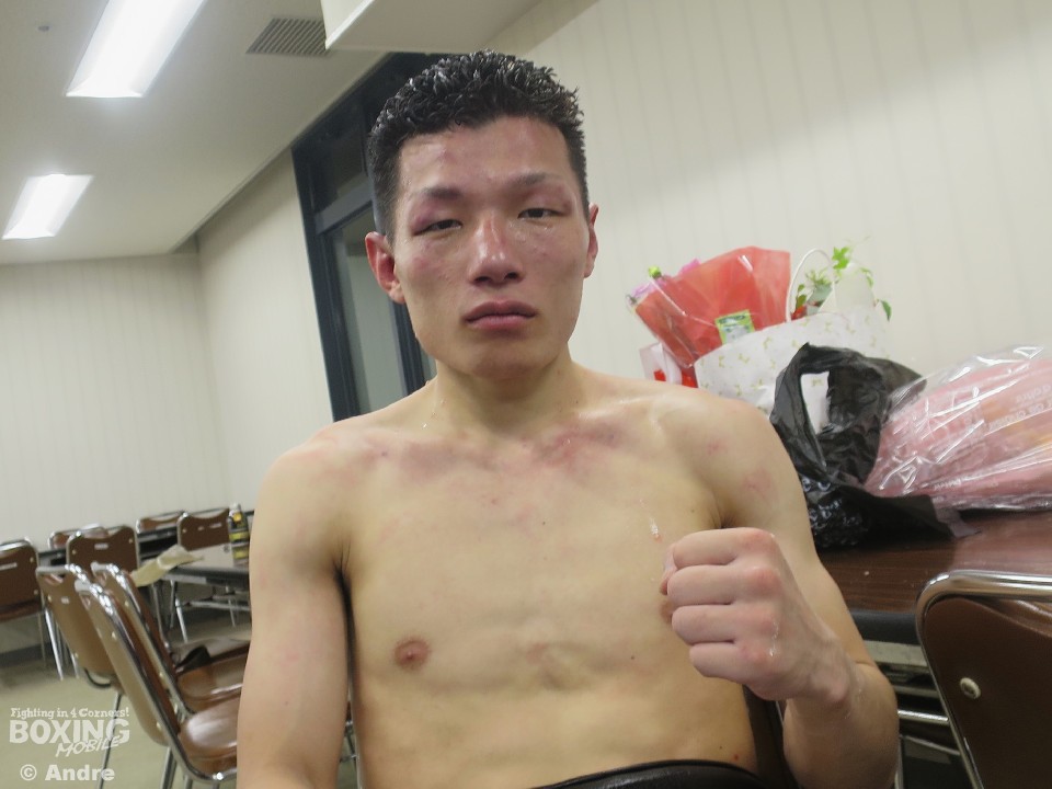 試合後、控え室に戻った小坂は「1ラウンド目に相手が効いたのがわかったんですけど、決めきれず。パンチをもらいすぎましたね」と、反省の言葉が口をついた。「こんな試合しているようじゃ、タイトルは獲れないと思うので、もうちょっと色々考えて練習します」と、ふんどしを締め直した。