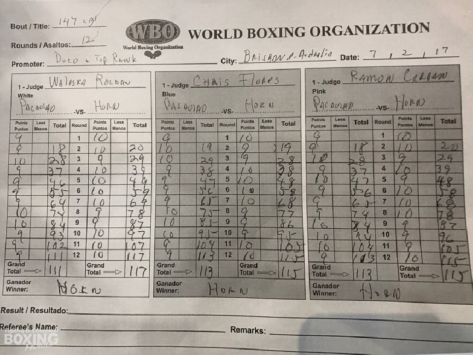 検証は当日の採点をした3人とは別の国籍の異なる5人のジャッジが匿名で採点する形式を採った。その結果、115対113、114対113、114対113で三者がホーンの勝利を支持。ひとりは逆に114対113でパッキャオの勝利と採点した。残るひとりは114対114のドローだった。パッキャオがホーンをKO寸前に追い込んだ9回に関しては、3人が10対8と採点した。公式のスコアは115対113、115対113、117対111でホーンの勝利だったが、6ポイント差はともかくとして接戦のすえ新王者誕生という結果は妥当なところといえそうだ。
