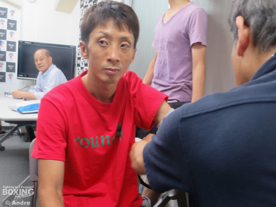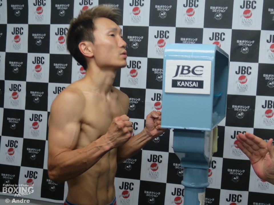 続いて秤に乗った角谷は48.7kgの200gアンダーでパスすると「調子は良いですね。うまく調整はできました。明日はチャンピオンと1位の対決らしく、タイトルマッチらしく、良い試合ができたら良いと思っています」と、日本タイトル3度目の挑戦に落ち着いた様子で語った。