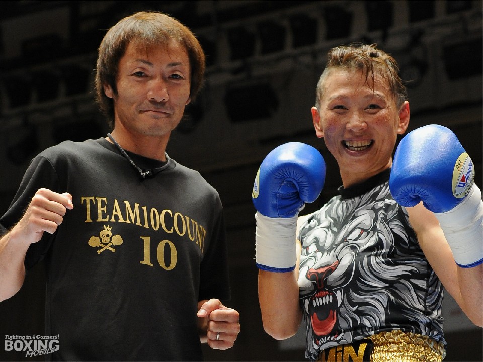 競輪界から100人の応援が駆けつけた島野は、試合後に「緊張した」と話しつつも、スーパーフェザー級で対戦した同じくデビュー戦の椙元をパワーで圧倒。最後は防戦一方の椙元をレフェリーが救出した。
