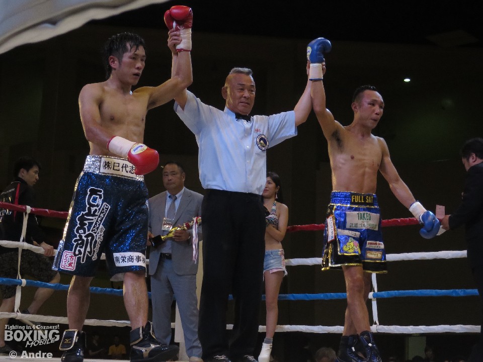 メインイベントのベテラン対決は技術の高い試合となった。川口は、坂本の動きを冷静に見極めると右ストレートを打ち抜いた。対して、坂本は右のアッパーを起点にまとをしぼらせないボクシング。一進一退のなか中盤、川口がやや優勢に試合を進めた。しかし後半、アゴを怪我したか、川口が後退を始める。坂本は好機を得たが、捉えることが出来ず試合終了。判定は3者3様でドローとなった。