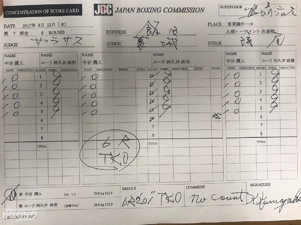 初回は阿久井がプレスをかけて攻勢を仕掛けるのに対し、サウスポー中谷はバックステップで距離を取った。2回になると中谷は相手の右を外し距離を潰して左右のアッパーをヒット。ペースを握った中谷はキレのあるジャブからワンツーを好打した。対する阿久井も右ストレートを返しスリリングな展開。4回、中谷は左右アッパーから左フックをねじ込むとロープに詰めて連打で攻勢。阿久井は次第に被弾が増えていった。6回、中谷の連打で防戦一方になった阿久井を見てレフェリーが試合をストップした。