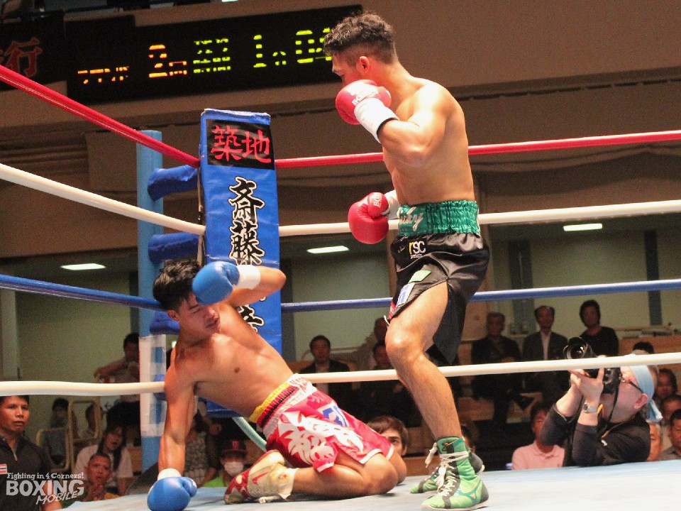 サウスポー同士試合は初回から内藤が鋭いジャブをヒットしリズムをつかむと、ワンツーを好打。ペッチムアングスリもジャブの打ち終わりに右フックを狙った。2回、内藤はロープに詰めて右ボディをめり込ませて先制のダウンを奪うと、さらに2度のダウンを追加しフィニッシュに持ち込んだ。