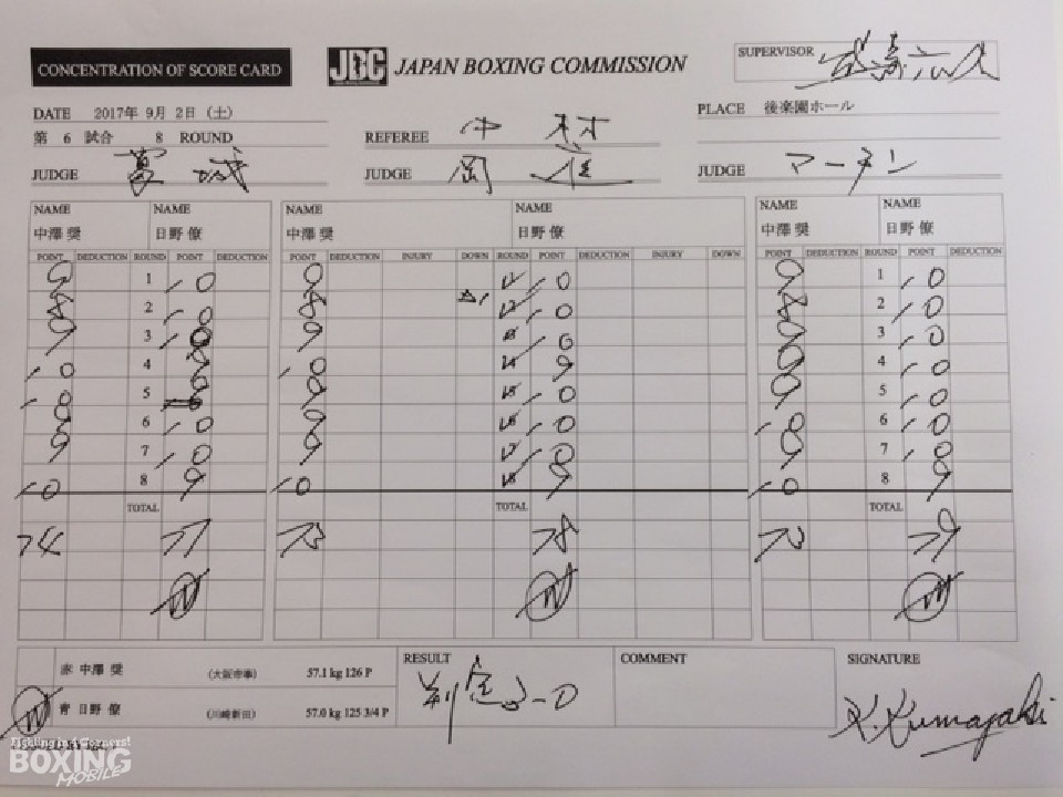 長身サウスポーの日野はワンツーを上下に打ち分けると、2回には右フックでダウンを奪った。ダメージの少ない中澤はプレスをかけてワンツー、左フックを決めて反撃したがペースを奪うには至らず。中盤以降は日野が左ストレート、右フックで迎え撃った。中澤は決定打を打ち込むことができず失点した。最大6ポイント差をつけた日野が判定勝ちした。