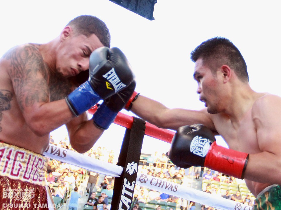 指名挑戦権を獲得したのはエストラーダだった。直前のオッズで5対3とリードしていたエストラーダに対し、クアドラスが右で仕掛けて出た。エストラーダは落ち着いて迎え撃つ構えをみせた。クアドラスはときおり構えを左にスイッチするなど工夫もみせ、調子のよさを感じさせた。やや後手にまわった印象のエストラーダは3回後半から前に出て圧力をかけ始めた。競ったラウンドが続くなかクアドラスは足をつかいながら頻繁に左右にスイッチ、試合を主導していることを印象づけようとしたが、エストラーダもインサイドからパンチを繰り出して譲らなかった。