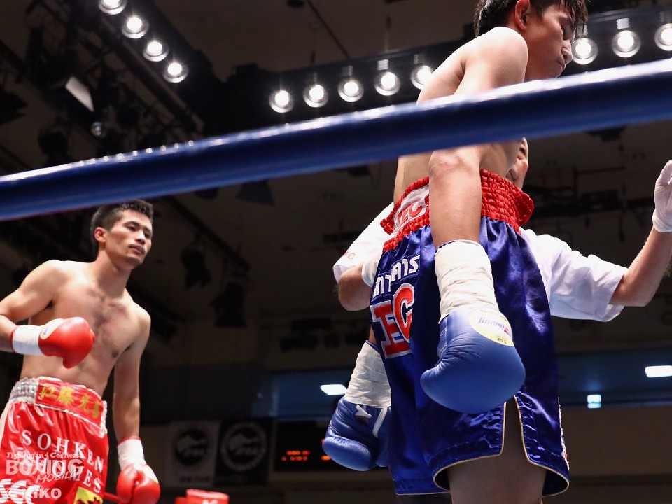 初回は、175pと江藤を1p上回る長身のタイ人が積極的にジャブ、ワンツーを突き懐の深さを見せたが、江藤は冷静に距離を測ると単発の好打から徐々にペースアップ。3回に入ると打ち合いのなかで左フック、右アッパーを効かせダウンを奪った。ここは立ち上がったワチャラポンだが、ダメージの色は濃く、左フックでこの回2度目のダウン。あとは一方的となり、レフェリーストップによる3回TKOで江藤が快勝。15年11月の世界戦敗退から4連勝を飾った。