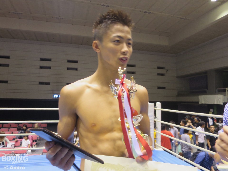 敢闘賞は、2度のダウンを跳ね返し、最終回、見事なラッシュをみせ逆転TKO勝利を収めたた木村が受賞。「良かったです。徳山さんが今日誕生日だったので、ホンマに勝てて良かったです。また、次の試合に備えて、練習頑張ります」と、偉大な高校の先輩、元WBC世界スーパーフライ級王者の徳山昌守(金沢→引退)の誕生日に華を添えた。