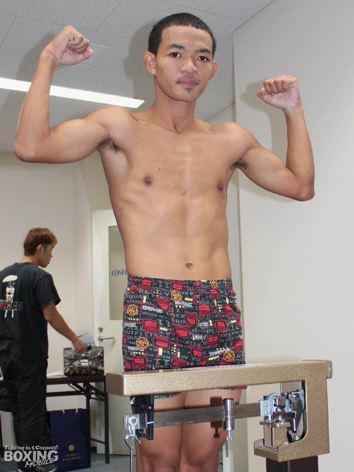 これが3度目の来日となるペットガオラットは500gアンダーの53.0kgでパス。先日、ローマン・ゴンサレス(ニカラグア)を4回KO勝ちで返り討ちしたWBC世界スーパーフライ級王者のシーサケット・ソールンビンサイ(タイ)に憧れているというペットガオラットは「勝敗はどうなるかわからないが明日は精一杯頑張る」と静かに闘志を燃やした。
