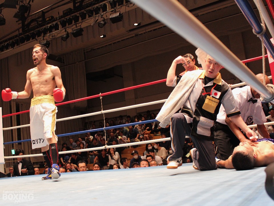 ともにKOで勝ち上がってきたジロリアン陸(29=フラッシュ赤羽)と江澤宏之(28=角海老宝石)によるスーパーフェザー級4回戦は、初回、ジロリアンがジャブを突きながらワンツーを好打し、さらに右アッパーで顔をのけぞらせた。中盤、江澤を強めワンツーで反撃。しかし、ジロリアンは4回に左フックでぐらつかせると怒涛の連打でストップを呼び込んだ。