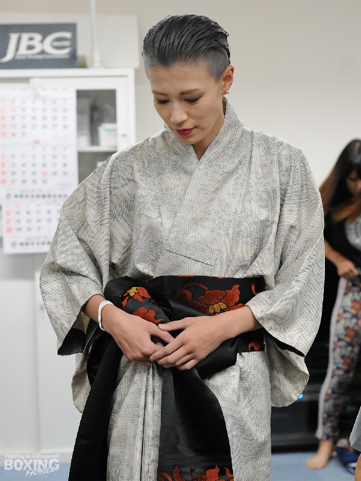 計量時のパフォーマンスが何かと話題になる元東洋太平洋女子スーパーバンタム級王者の高野は、銀髪に染めサイドを刈り上げたオールバックのヘアースタイルに着物姿と、任侠を思わせる出で立ちで登場。秤を前に着物を脱ぐと、背中に入れた刺青ならぬボディペイントを報道陣に見せつけた。朝6時に起きて制作に5時間を掛けたペイントは、自身を黒豹、龍を吉田と捉え、明日の激戦をイメージ。高野は「必ず初代王者を獲得し、歴史に名を残す」と意気込んだ。