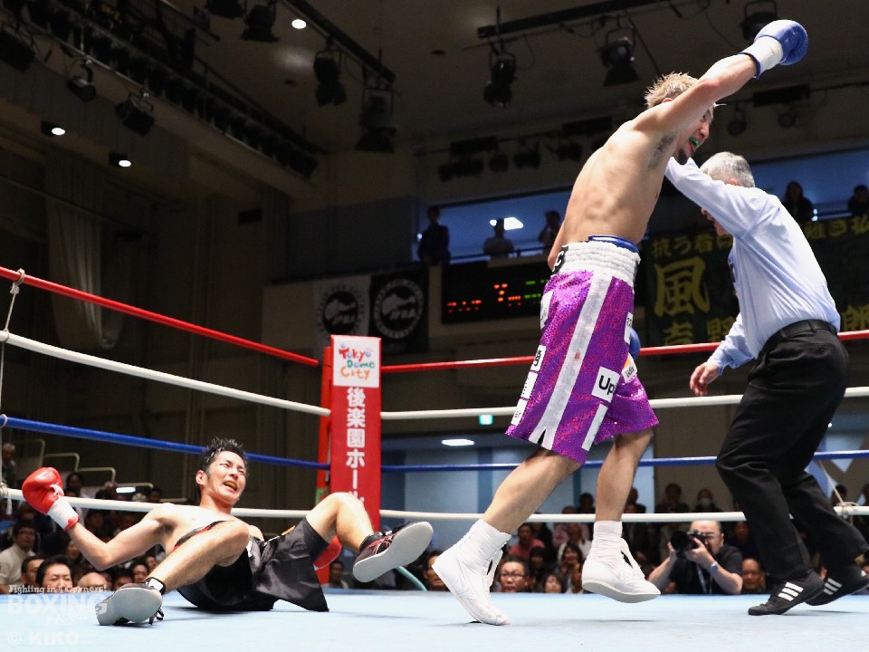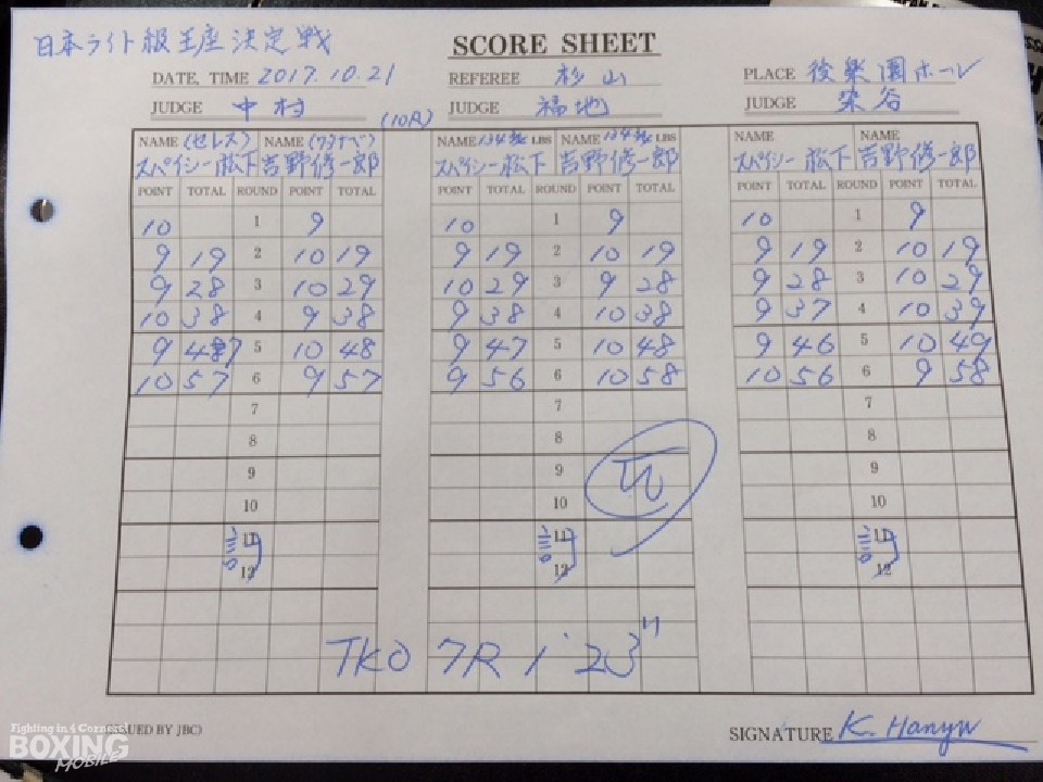 初回、松下が独特のリズムから左右のフックで攻勢を仕掛けるが、吉野は慌てることなくジャブからワンツーで組み立てた。3回、松下はプレスに耐えながら右フックを返し曲者ぶりを発揮。4回、松下は積極的に攻め立てるが、吉野は圧力を強めると右フックで左目上を切り裂いた。前半終了時の公開採点は49-46×1、48-47×2で吉野がリード。6回に吉野はボディを効かせて流れを作ると、7回に左フックから右ストレートをテンプルに決めてダウンを奪った。なんとか立ち上がった松下だったが、連打を浴びて再びダウン。ここも立ち上がった松下だが最後はキャンバスに沈んだ。吉野が無傷の6連勝でタイトルを獲得した。