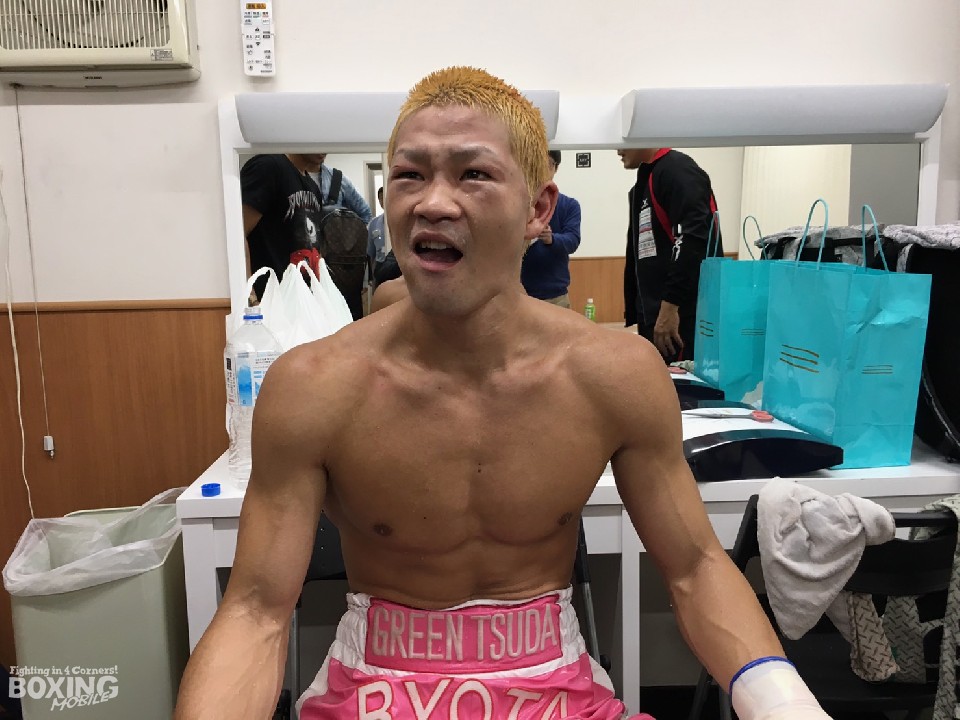 大粒の汗を拭きながら控え室に戻った矢田は「尹さんは強かったです。前半はポイントを取れたと思ったんですが、途中でボディを効かされました。でも、7〜8ラウンドが勝負だと会長に言われて頑張りました」とリングの興奮をそのままに一気に話すと「今日は気持ちの勝利です」と試合を振り返った。