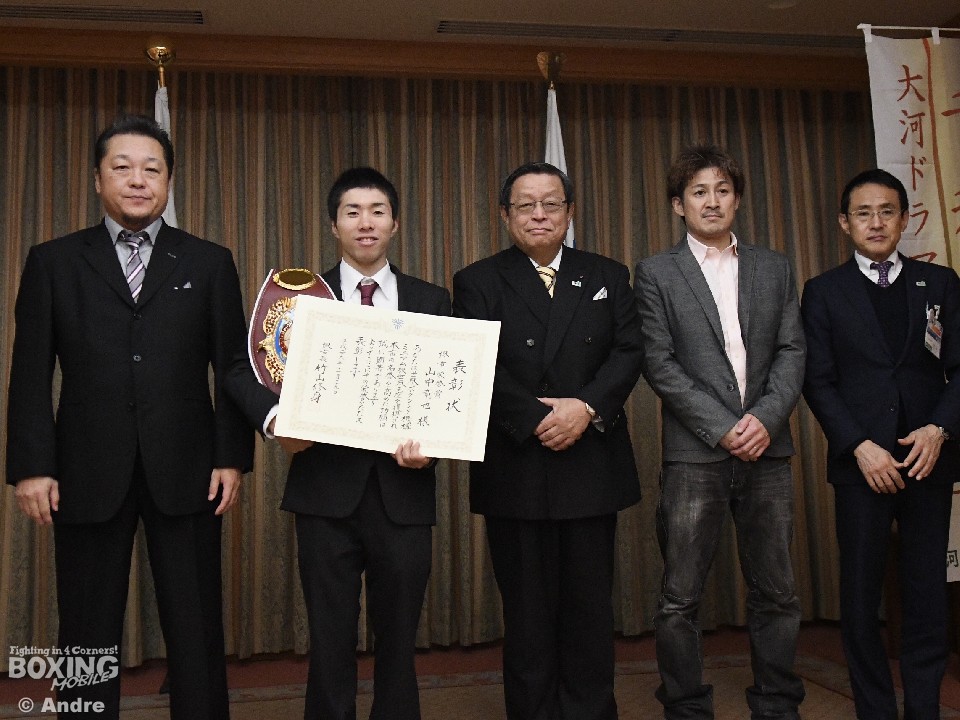 山中は「本日はこのような賞をいただき本当にありがとうございます。8月の試合は、会長や、江藤会長代行とたてた作戦通りに試合ができました。今後もこの賞に恥じぬように、防衛をたくさんしていきたいと思います。応援よろしくお願いいたします」と、感謝の言葉を口にした。