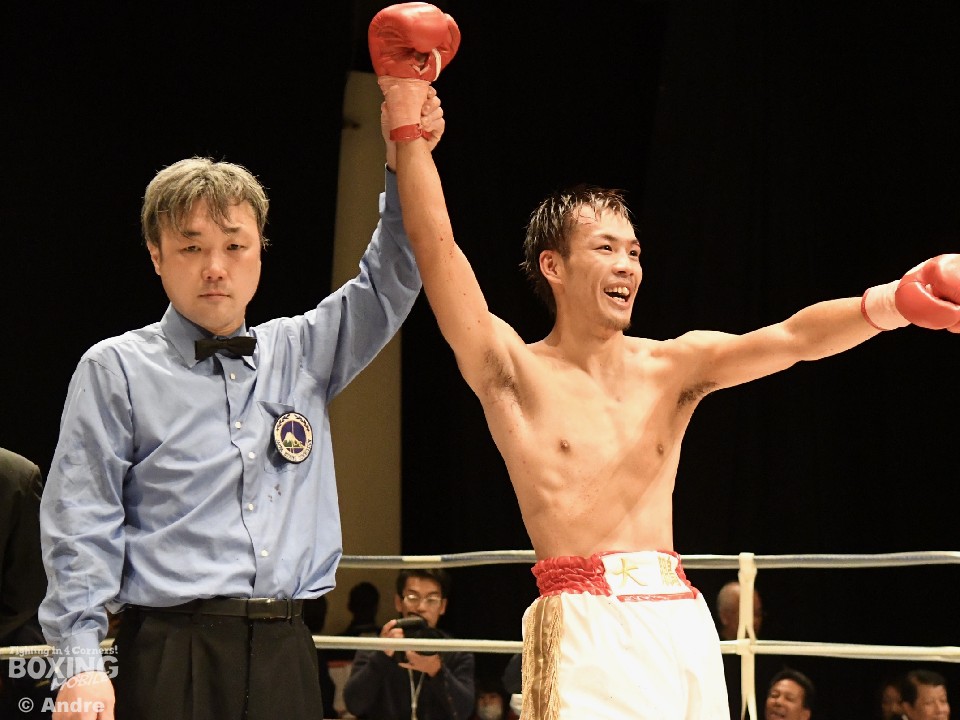 試合後、控え室に戻った大里は「杉田選手のパンチは硬かったです。これがランカー対決なんだなって思いました。何回か気持ちの折れそうなラウンドがあったんですけど、気持ちを強く持ってやって本当によかったです」と、試合を振り返った。「昨日、弟の登が負けてしまったんですけど、弟は本当にスパーリングとかしても強いし、それを試合に出せれば強くなると思います。また、一緒に上を目指します」と、兄弟王者に向けて、気持ちを新たにした。