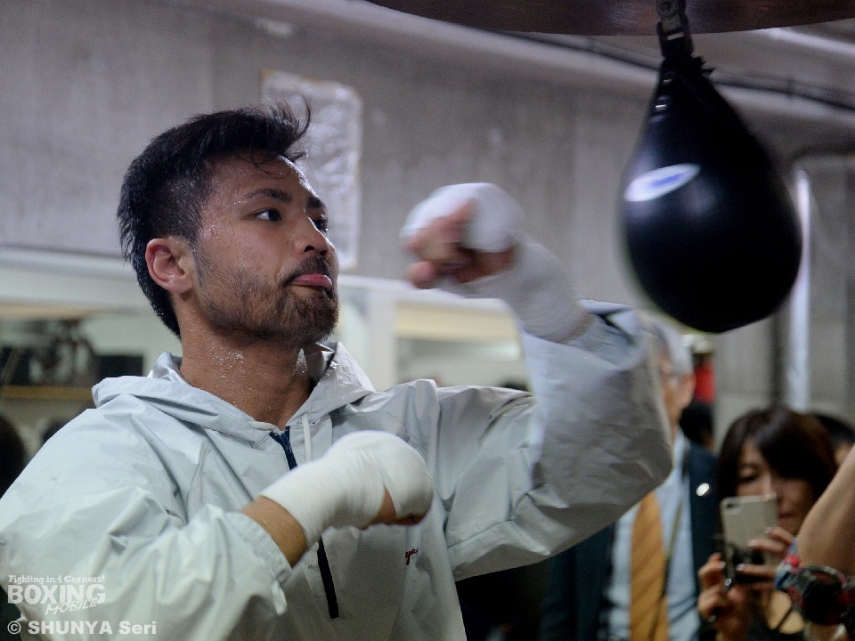 公開練習では最初にシャドーボクシングで体を温め、元WBA世界フライ級暫定王者・江藤光喜(白井具志堅)とのスパーリングを1ラウンド、その後にシングルパンチングボール。最後は長くエアロバイクを漕いで汗を流した。