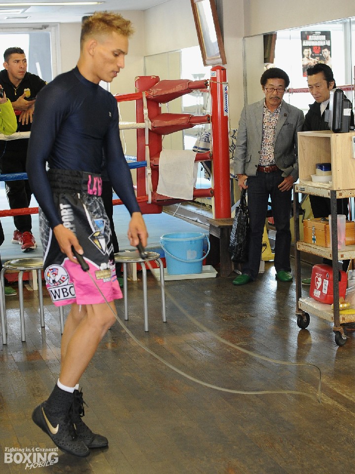 WBC世界フライ級王者の比嘉大吾(22=白井・具志堅スポーツ)に挑む同級2位のクリストファー・ロサレス(23=ニカラグア)が10日、都内のジムで練習を公開。偵察に訪れた敵陣営の具志堅用高会長、野木丈司トレーナーが見守るなか、シャドー、縄跳びと軽めの練習ながらフットワーク重視の軽快な動きを披露した。