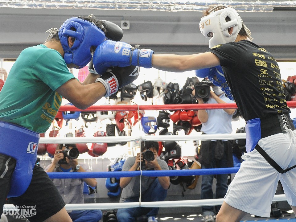 KOの期待を背負った田口は会見後、シャドーからマススパーリング、ミット打ちなど12ラウンドの練習でたっぷり汗を流した。スパーでは的を絞らせない動きから詰める作業に重点を置き、石原トレーナーとのミット打ちでは右ストレートの角度、コンビネーションの確認を行い、パンチがないと言いつつ室内に快音を響かせていた。