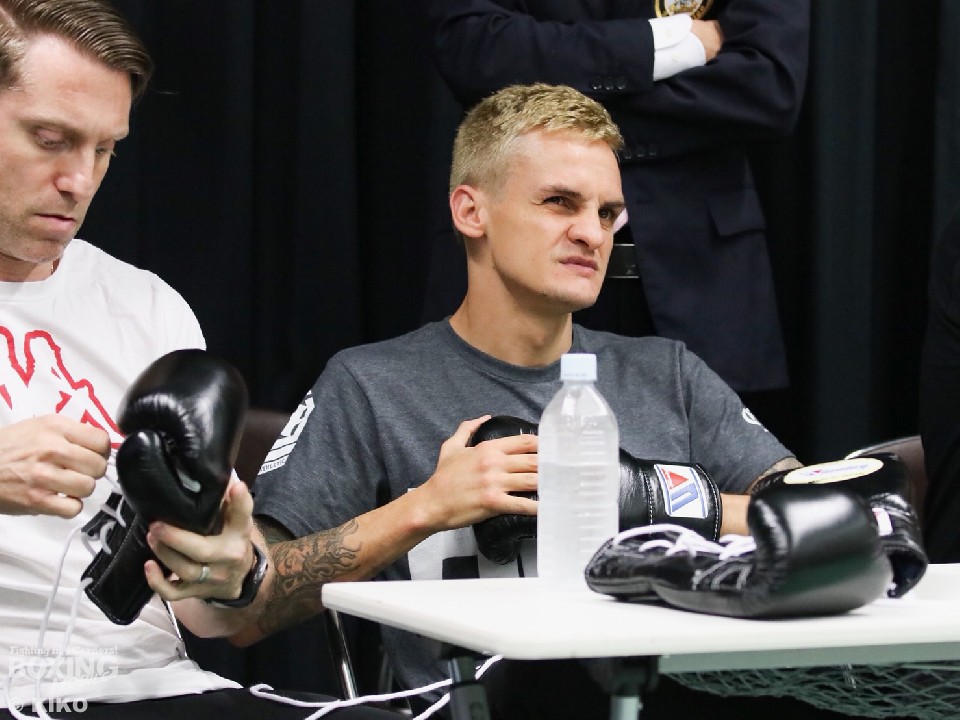 2団体の調印が終わり、グローブチェックでは日本製の8オンスが用意され、田口は3年半前の世界挑戦時から変わらぬ挑戦者カラーの青、ブドラーは黒を選んだ。