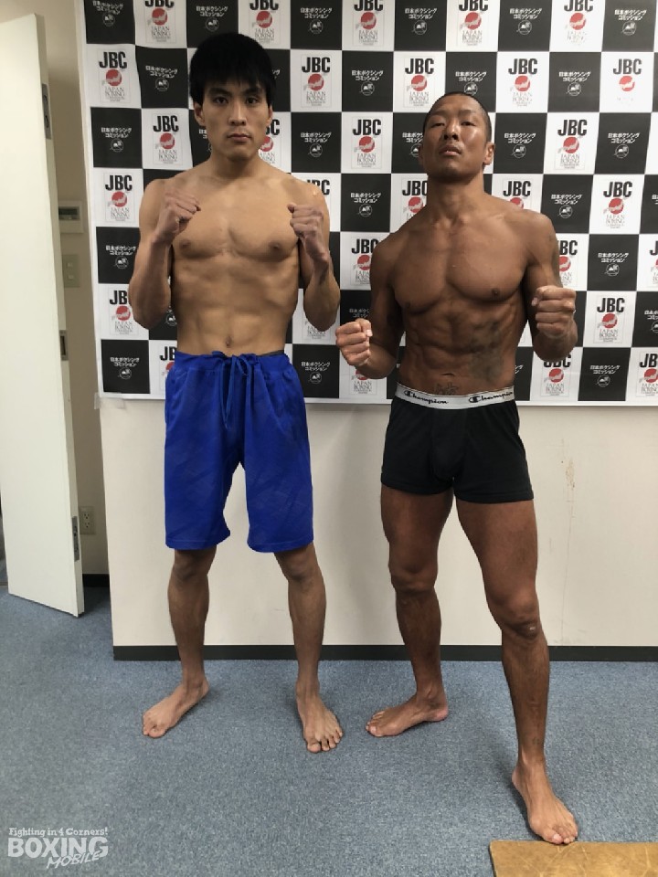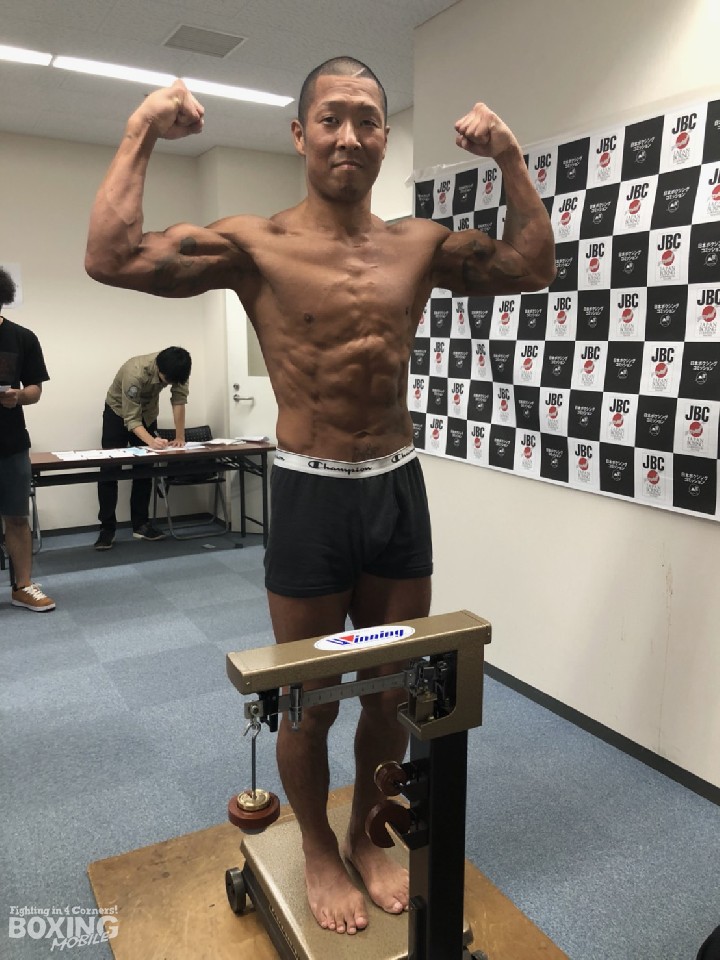 今年の6月16日にプロボクサーの定年、37歳を迎える米重貴博(八王子中屋)が26日、現役最後の前日計量に臨んだ。ラストファイトはスーパーウエルター級4回戦。これまでの戦績は、6戦3勝(1KO)3敗(2KO)。 ラストマッチの相手は、今月11日に25度目の誕生日を迎えたばかりの舟津純(伴流)。こちらも戦績は、6戦3勝(1KO)3敗(2KO)。明日、勝ち越すのはどっち? 米重の前回の試合は4月2日。試合間隔がやや短いのには理由があった。