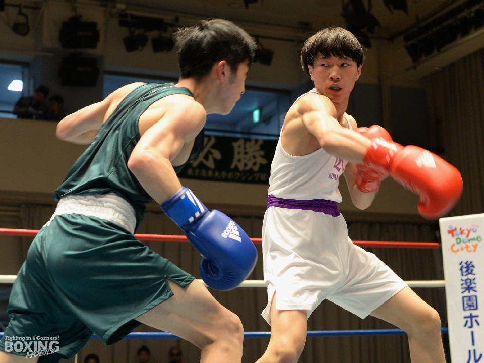 あとのない拓大ではライトウェルター級の柴田尊文が、日大の主将、鈴木稔弘に猛ラッシュしたが、これをカウンターのチャンスに変えて2度のカウントを奪っての初回42秒でRSC勝ち。