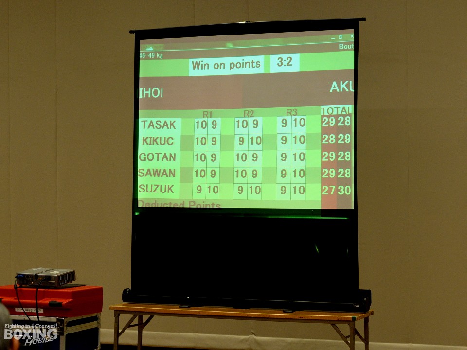 フライ級の小川達也(駒大)と中垣龍汰朗(東農大)の国際経験豊富なルーキー対決も白熱し、スコアは30-27、30-27、28-29、27-30、28-29と割れた。なお、今回のスコアボードでは今までのようにジャッジの所属する都道府県ではなく、個人の名前が載る形がとられた。
