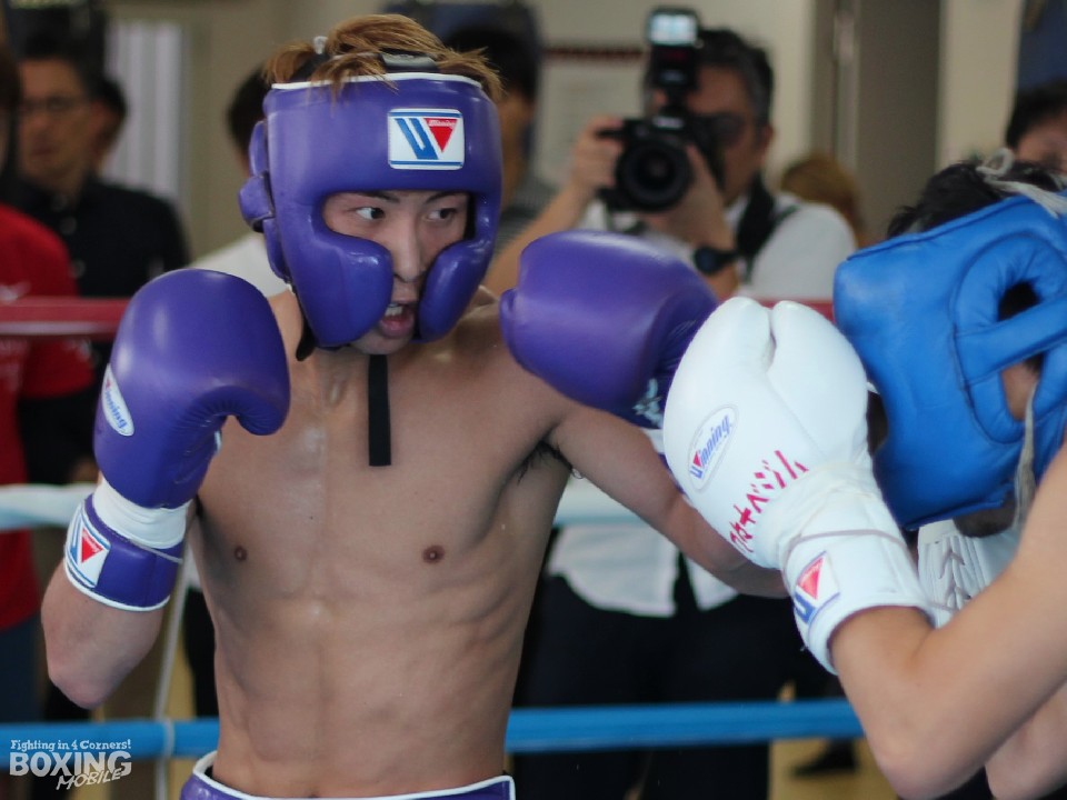 会見後には元日体大ボクシング部でワタナベジムからデビューする川畑嗣穂(かわばたしすい)と3ラウンドの軽めのスパーリングを披露。相手のジャブを軽やかなステップでかわすとジャブをヒットさせ、2回には右を合わせて連打で攻勢。この日は思い切り打ち込まず、距離感を確かめながらディフェンスに時間を費やした。これからはスパーリングは行わず体重調整に努める。