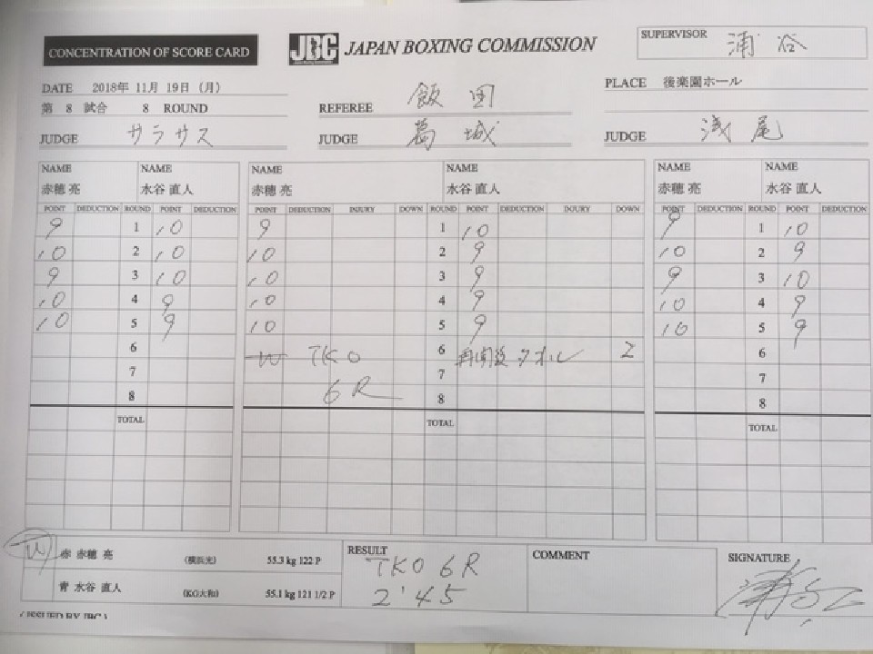 まずは水谷がジャブから左を当て上々のスタート。初回は様子見で手を出さなかった赤穂だが、2回から左フックをヒットしエンジンをかける。水谷は強引に前に出る赤穂を上手く捌きながらワンツーをヒット。しかし、赤穂は強烈なボディブローを決め水谷の動きを止めると、6回に右のショートで倒し、再開後も連打でダウンを追加。最後まで勝負を諦めなかった水谷だが陣営からタオルが投入された。