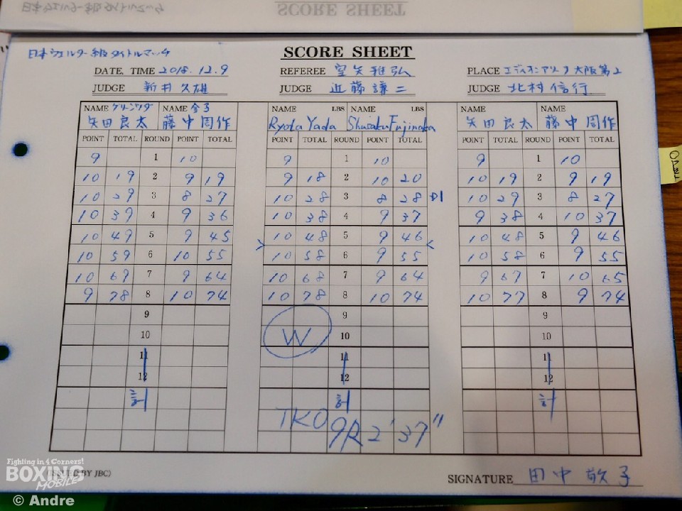 中盤は距離を詰めワンツーから攻め立てる藤中に対し、矢田は右アッパーを突き上げると右フックを強振。8回は、藤中が右フックでのけぞらせショートアッパーで動きを止めたが、矢田もフィジカルの強さを活かしワンツーで対抗。続く9回も矢田が左フックでグラつかせ、連打で猛攻をかけた。ここでも驚異的な粘りを見せた藤中だったが、最後はダメージを重く見たレフェリーが抱きかかえた。
