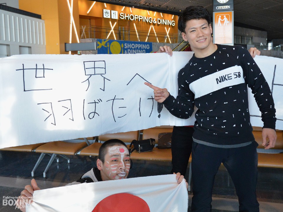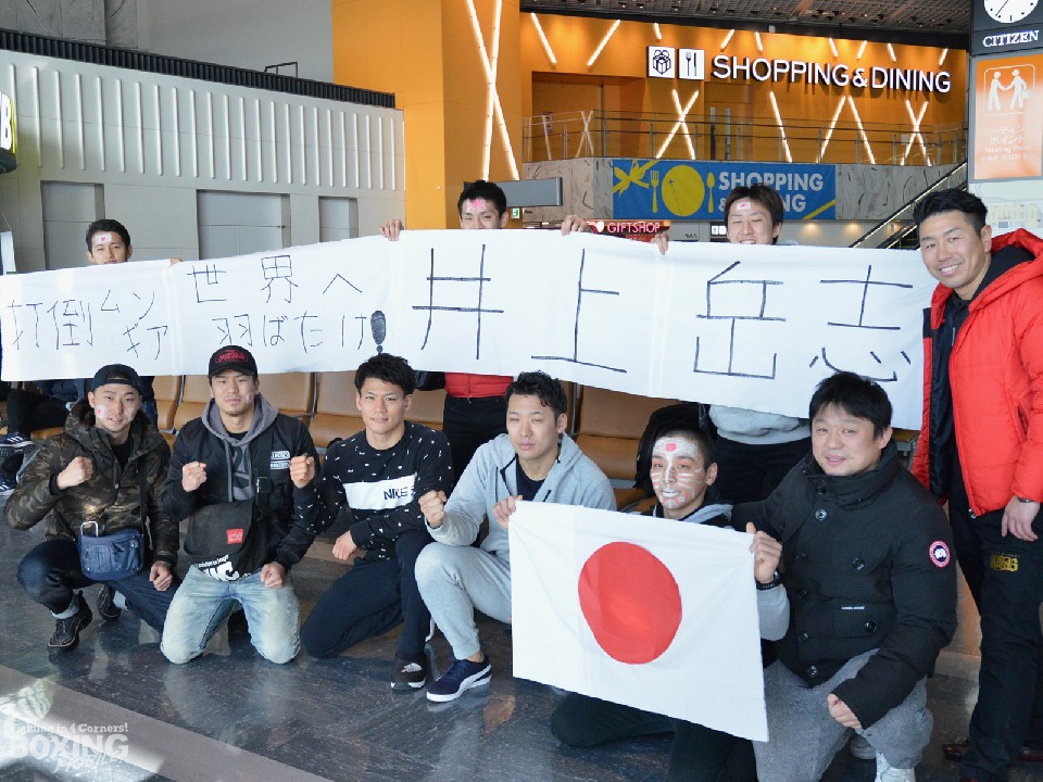 「18000人規模の会場はブーイングも凄そうだが、それすらも楽しみたい。勝利者インタビューのコメントも英語で用意して覚えた」と話し取材を終えると、ここでジムの寮生6人が垂れ幕を持って駆けつけるサプライズ演出が。感動と驚きで顔がほころんだ井上は、後輩たちにも勝利を誓い機上の人となった。