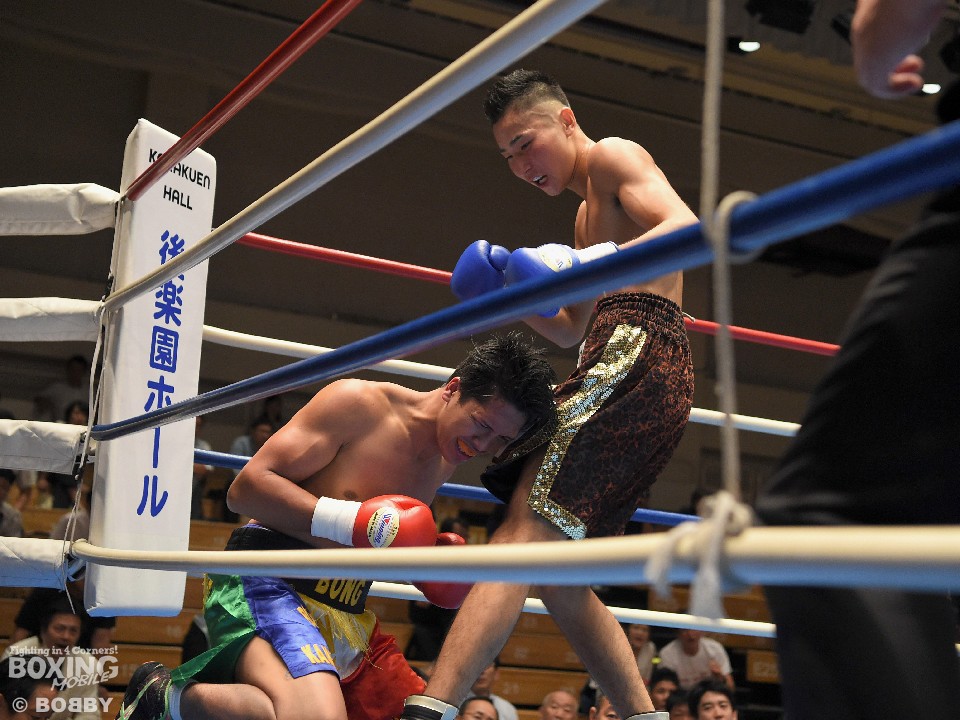 セミファイナルでは日本ライト級4位の富岡樹(22=REBOOT)がマーボン・ボディオンガン(25=比)とライト級8回戦で対戦。初回から富岡がジャブを飛ばしながら左を軸にコンビネーションを決めペースを掌握した。すると2回、富岡は相手の前進を軽快な動きで避けると痛烈な左ボディでキャンバスに沈めた。ボディオンガンは苦悶の表情のまま10カウントを聞いた。