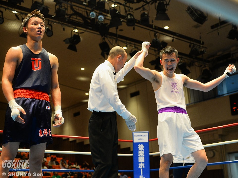 東洋大学は、フライ級の無冠のルーキー、政所椋(東洋大)と元・高校2冠の小川達也(駒大)の試合を制すなどで、苦手意識の強い駒澤大学に5対4で勝利した。今季、進境の著しかった今永虎雅(東洋大)は、昨年と同様、完山隼輔(駒大)に僅差で敗れた。