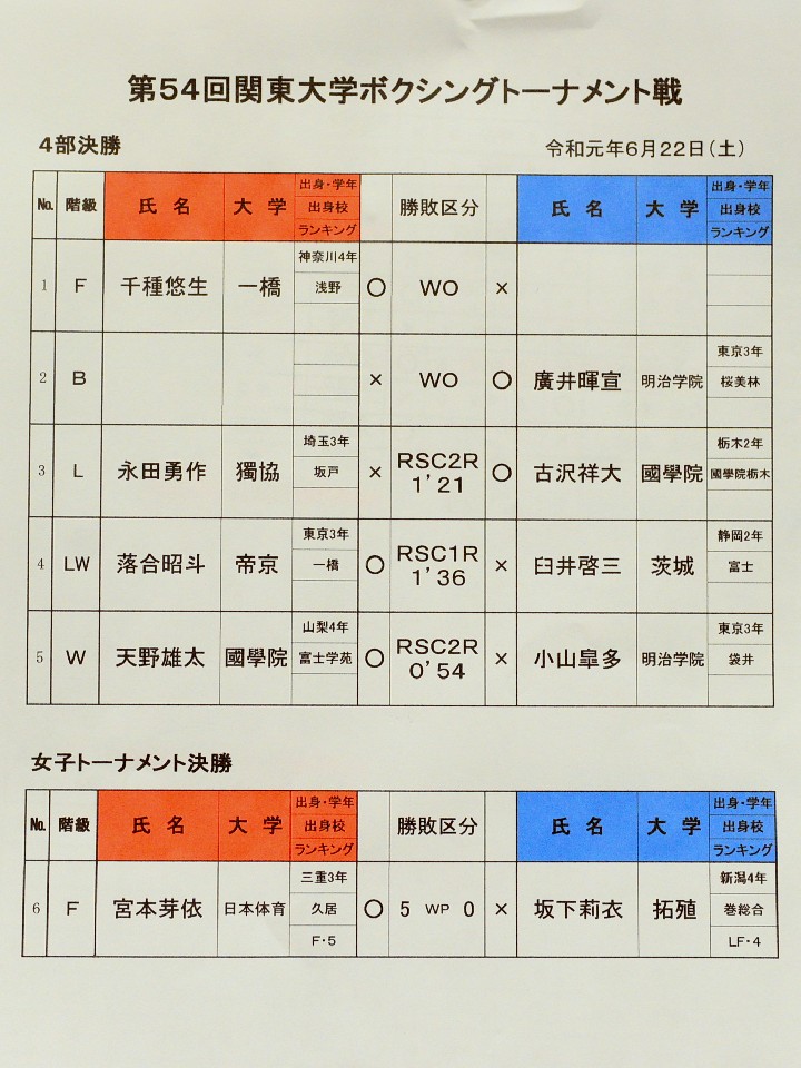 6月22日、東京・水道橋の後楽園ホールでは『第72回関東大学ボクシングリーグ戦』の第4週が行われた。午前9時半から先にスタートした4部トーナメントの決勝では、2階級を制した國學院大学が優勝を決め、3部最下位校との入れ替え戦への出場権を得た。 3部トーナメントの決勝戦も含まれる最終週は、7月13日に同じ会場で行われる。1部リーグで優勝を争う3校では日大が【4勝0敗・勝点25・RSC等5】、東洋大が【3勝1敗・勝点24・RSC等4】、東農大が【3勝1敗・勝点19・RSC等2】。