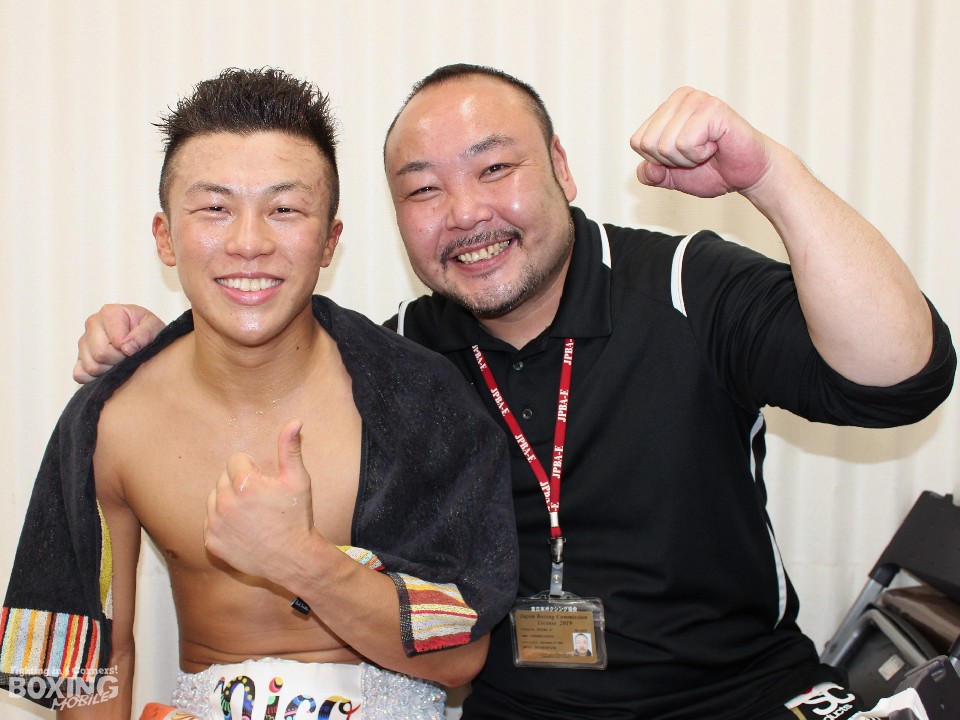 フェザー級への転向を明言した渡部は、「日本王座を狙っていきたい」と飛躍を誓うと、渡部を担当する小口忠寛トレーナーは、「げんを担いで10日間禁酒した効果が出た」と勝利を喜んだ。