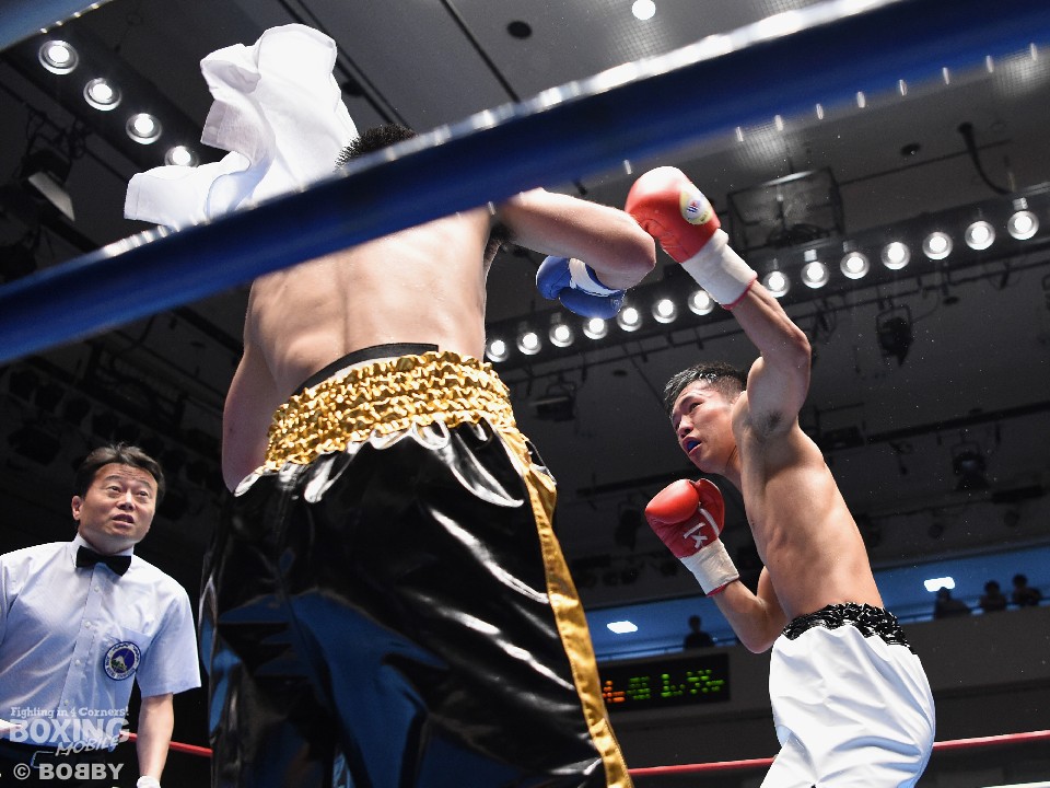 スーパーフライ級4回戦では碇瑠偉(19=厚木ワタナベ)と久保春平(22=宮田)が拳を交えた。初回、久保の左右フックを浴びて膝を揺らした碇だったが、ジャブで突き放すと2回にはワンツー、右アッパーで顔を弾いた。3回、久保は回転のある連打で攻勢。守勢を強いられた碇は4回、右フックでグラつかせるとパンチをまとめてストップ勝ちした。