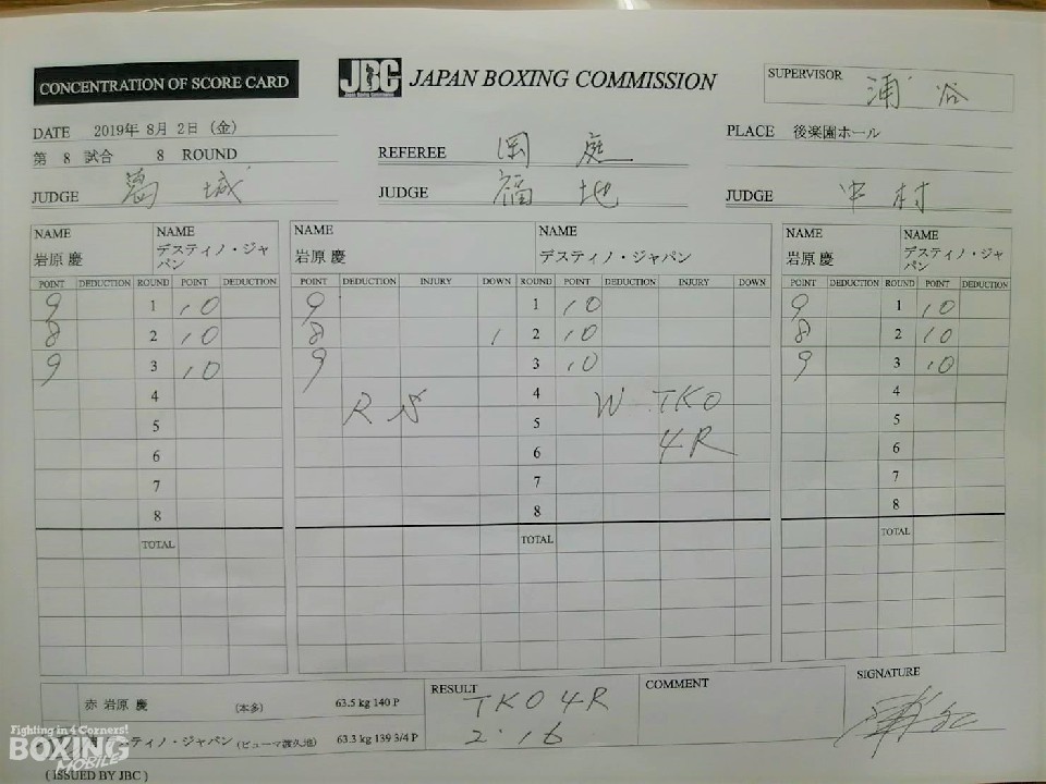 ディスティノが前の手で距離を測りながら単発の左フックをヒットしペースを握ると、2回に右アッパーを決めて先制のダウンを奪った。3回もディスティノが思い切りの攻撃で攻勢。守勢を強いられていたサウスポー岩原だが、4回にワンツーで腰を沈めさせて反撃。しかし、ここを踏ん張ったディスティノは右ストレートで顔を弾くと、ここがチャンスとばかりに怒涛の連打でストップを呼び込んだ。