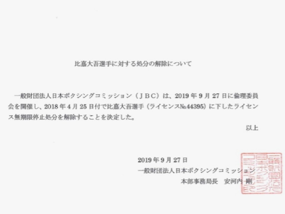 日本ボクシングコミッションは3日、9月27日に倫理委員会を開催し、元世界チャンピオンの比嘉大吾(白井・具志堅)に対して2018年4月25日に下したライセンス無期限停止処分を解除することを決定した。