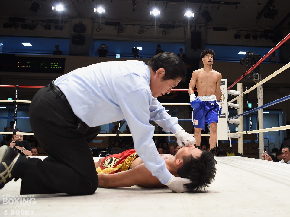 ジャブで距離を探った山口は、一瞬の踏み込みからワンツーを直撃! 後頭部を打ちつけたバンチャーを見てレフェリーがノーカウントで試合をストップした。